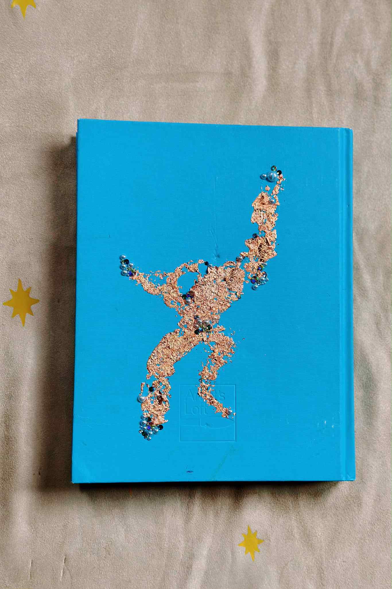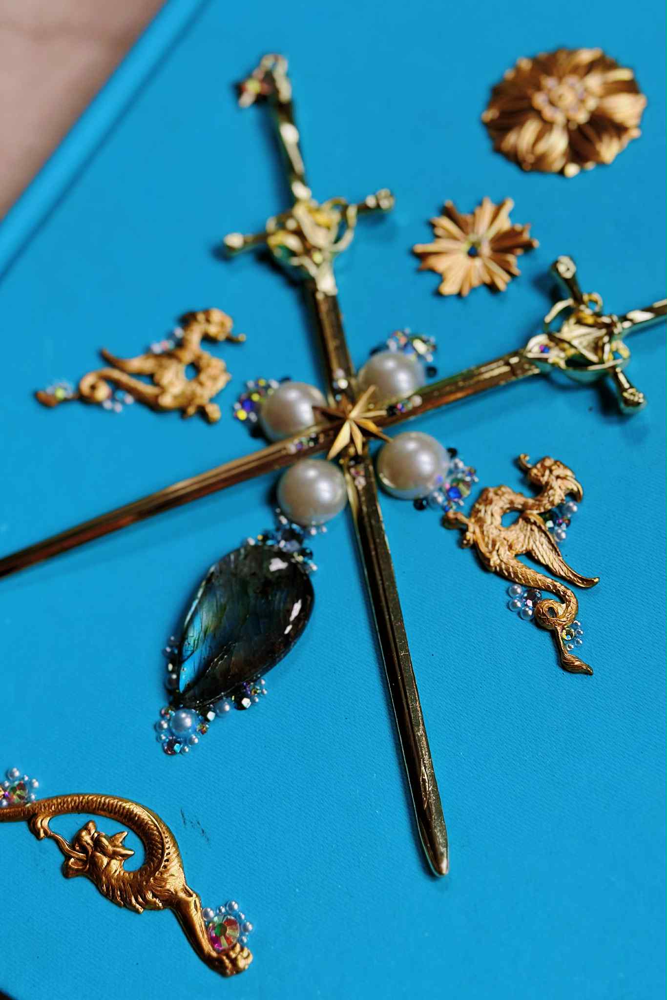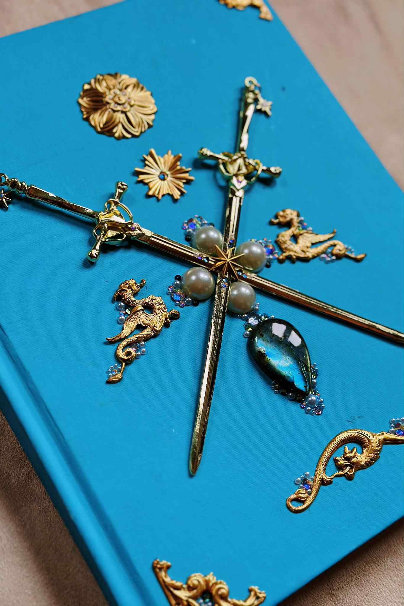 Book of the Stars [Sketchbook pages] : A stunning piece of labradorite surrounded by silver plated brass stampings, two of which contain a star and moon made of moonstone and highlighted with various Swarovski crystals. [Measures 5.25" x 8.5"]
