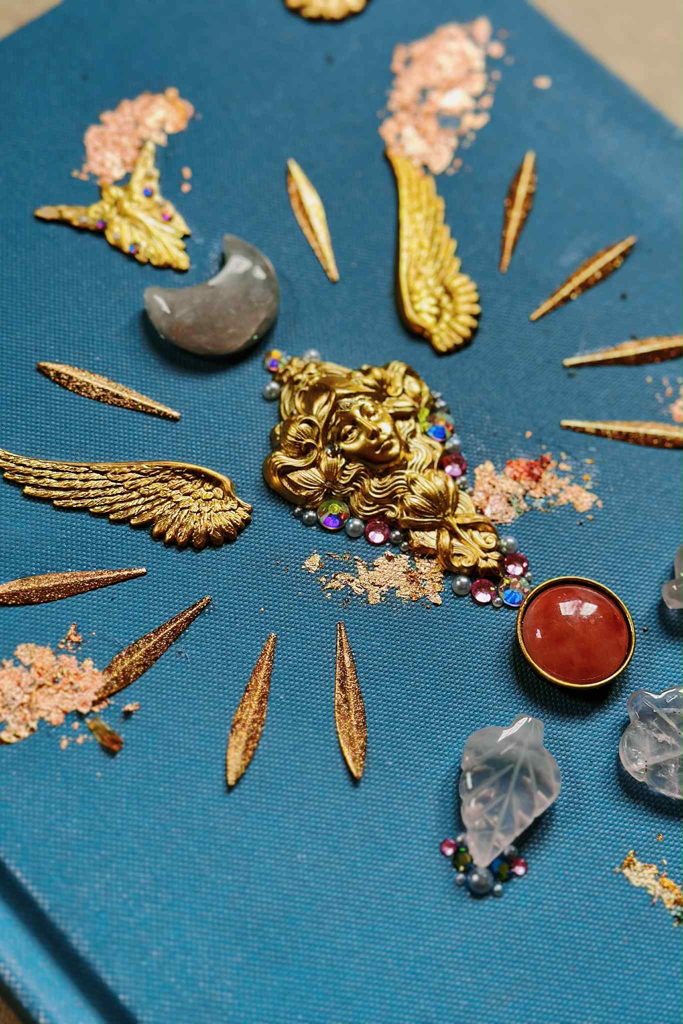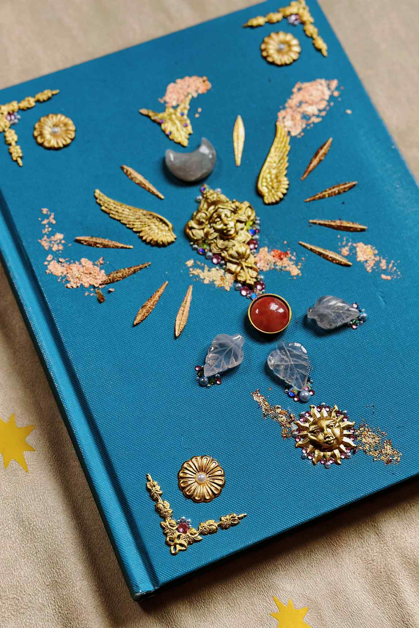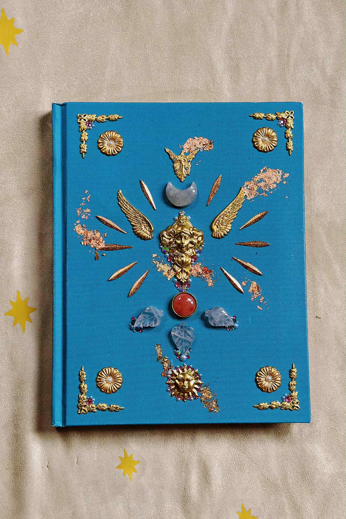 Book of the Flowered Crown [Lined pages] : A labradorite flower is surrounded by vintage brass stampings, sprinkled with various Swarovski crystals, and highlighted with aura quartz points. [Measures 5.5" x 8"]