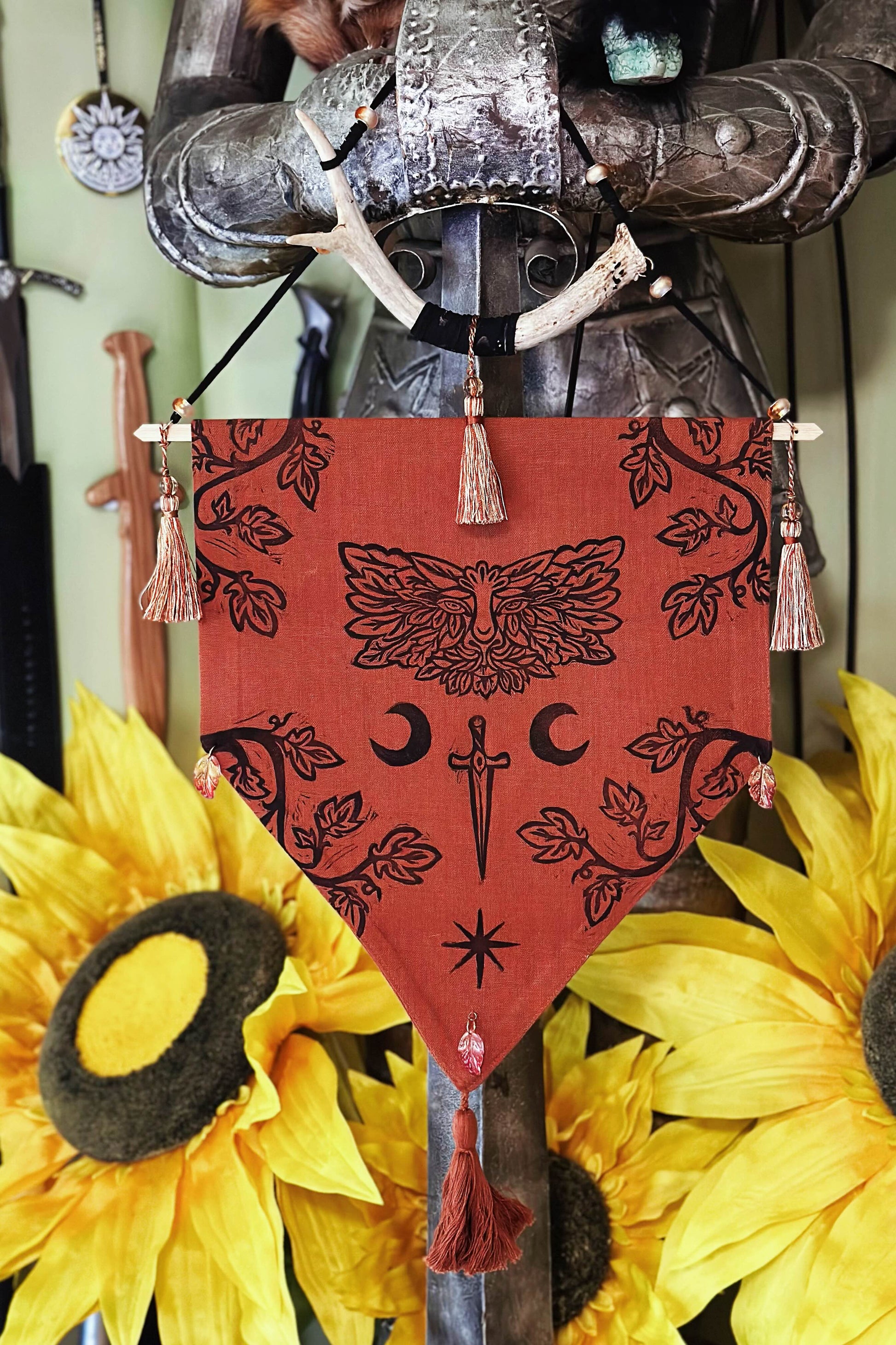 This banner is made with hand-carved block prints, an ethically sourced antler, and glass beads