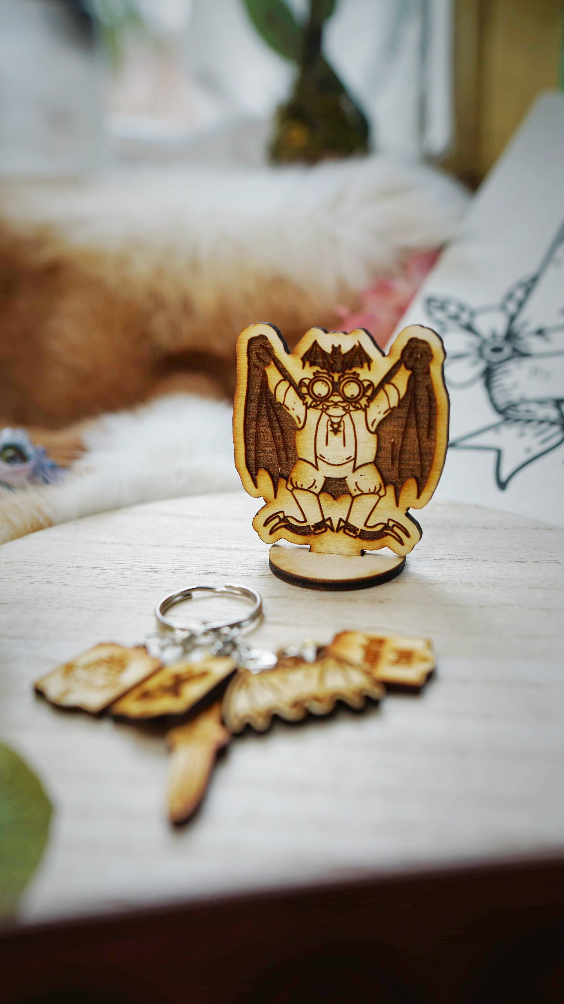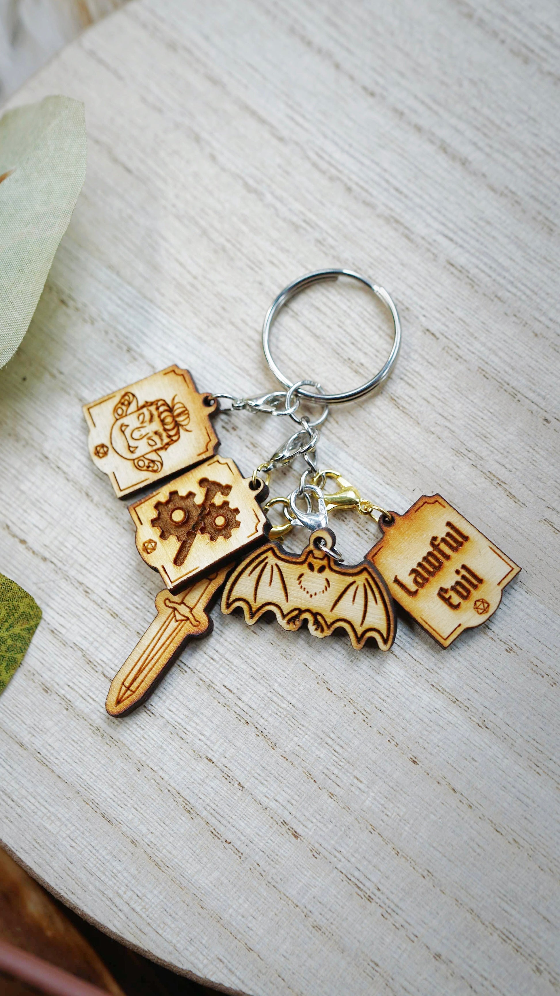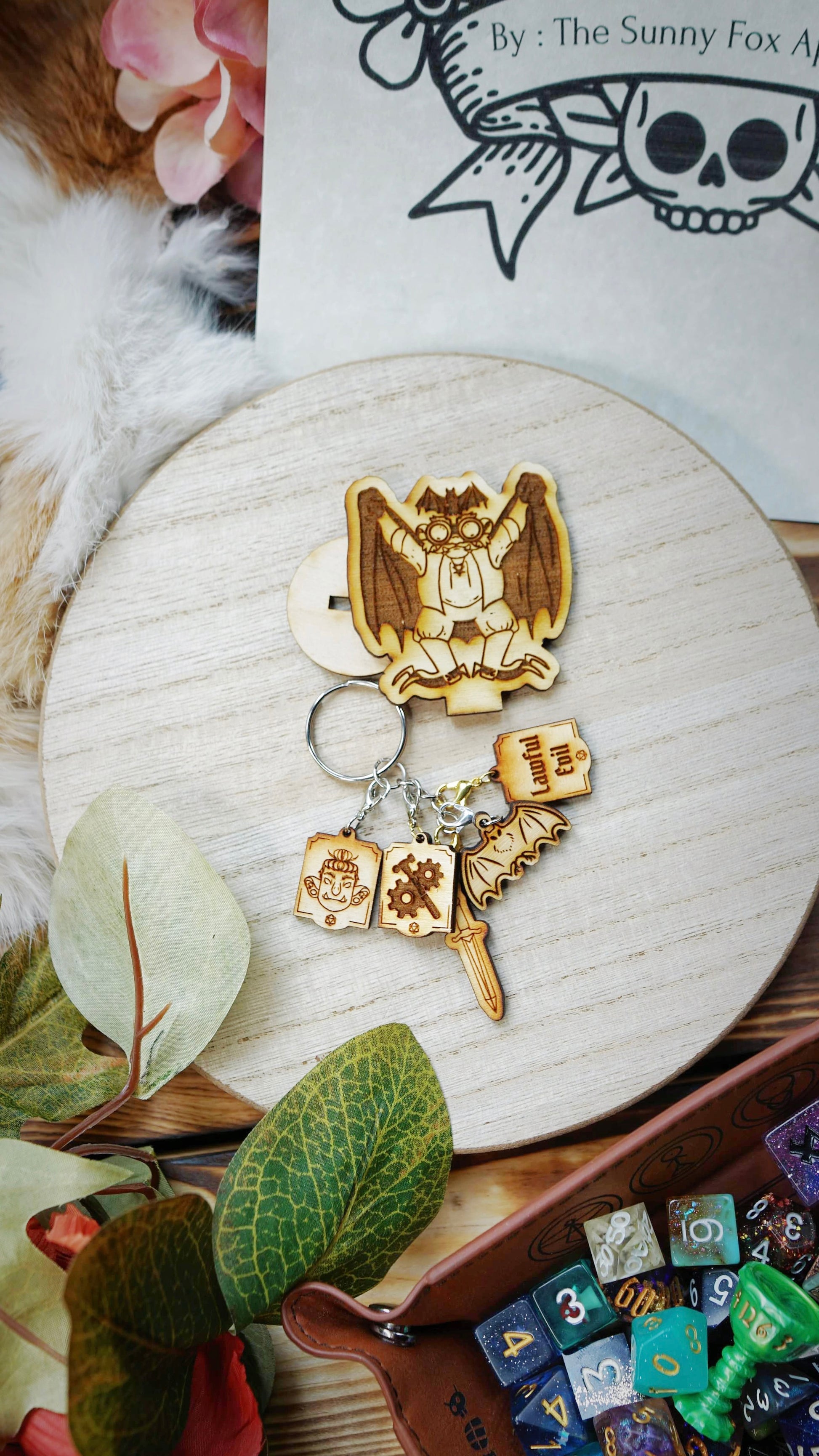The wooden miniature featured measures 2.5" tall and comes with an assemble-able base. The keychain featured comes with all the charms that represent this character attached with lobster clips.