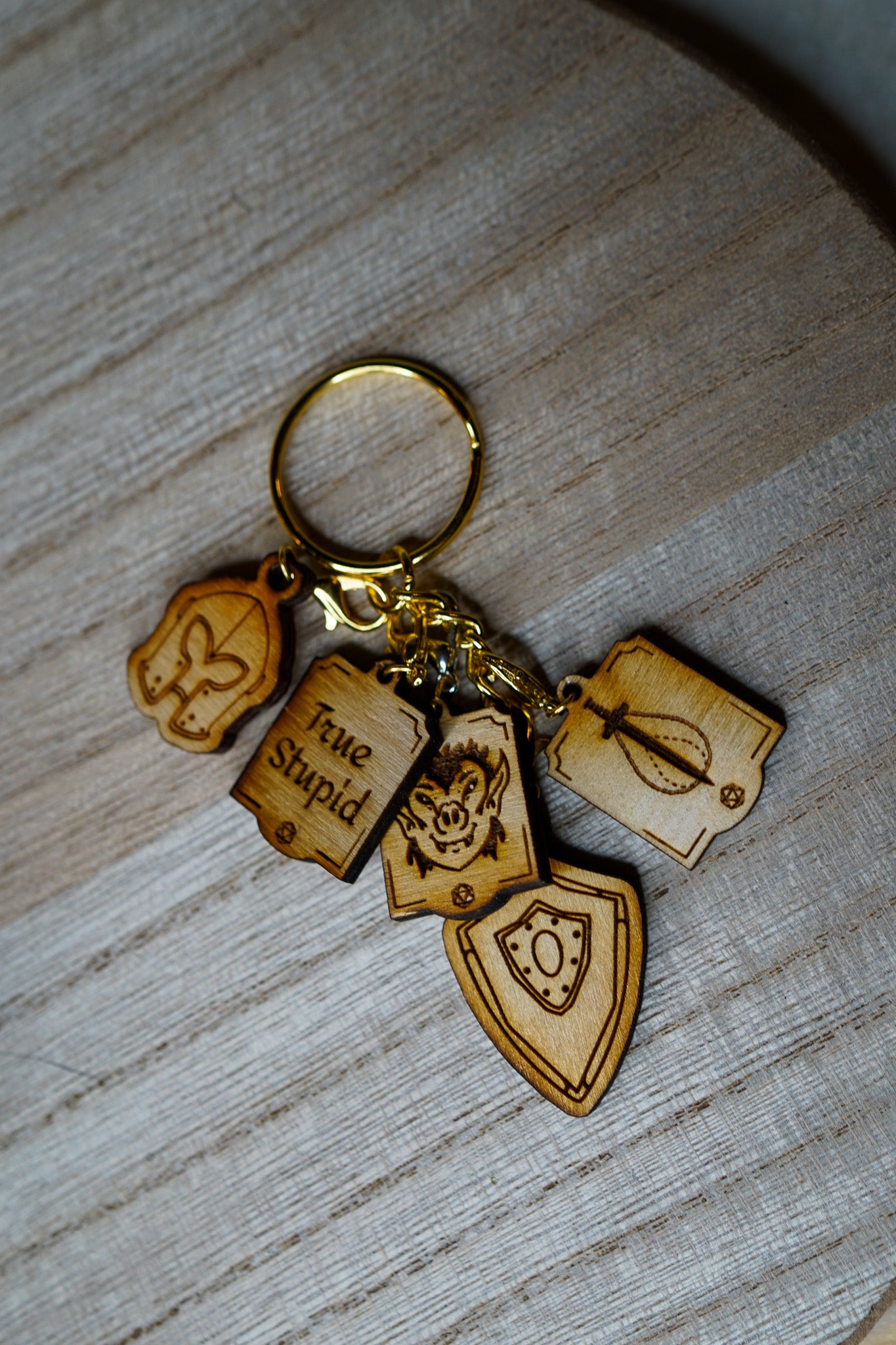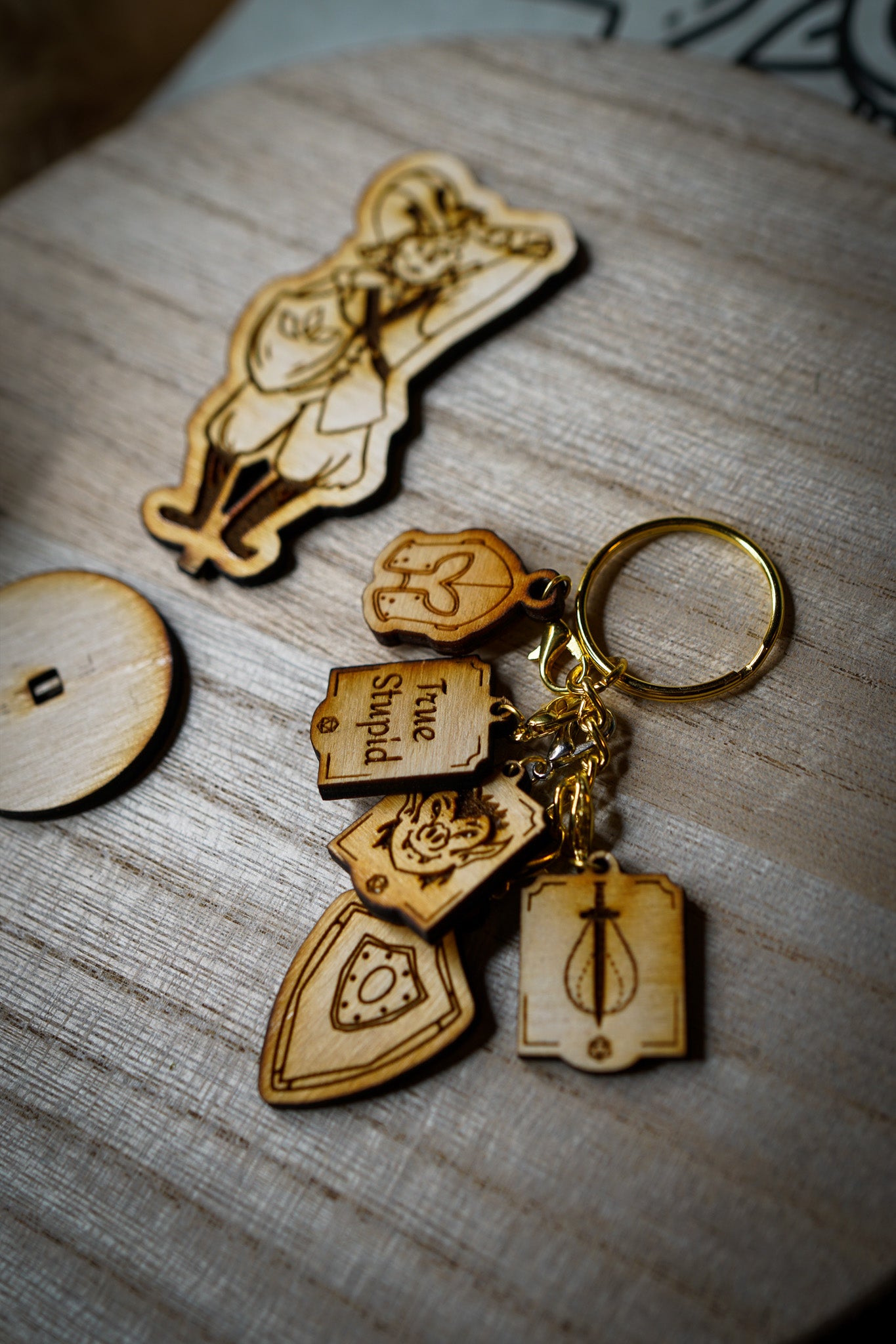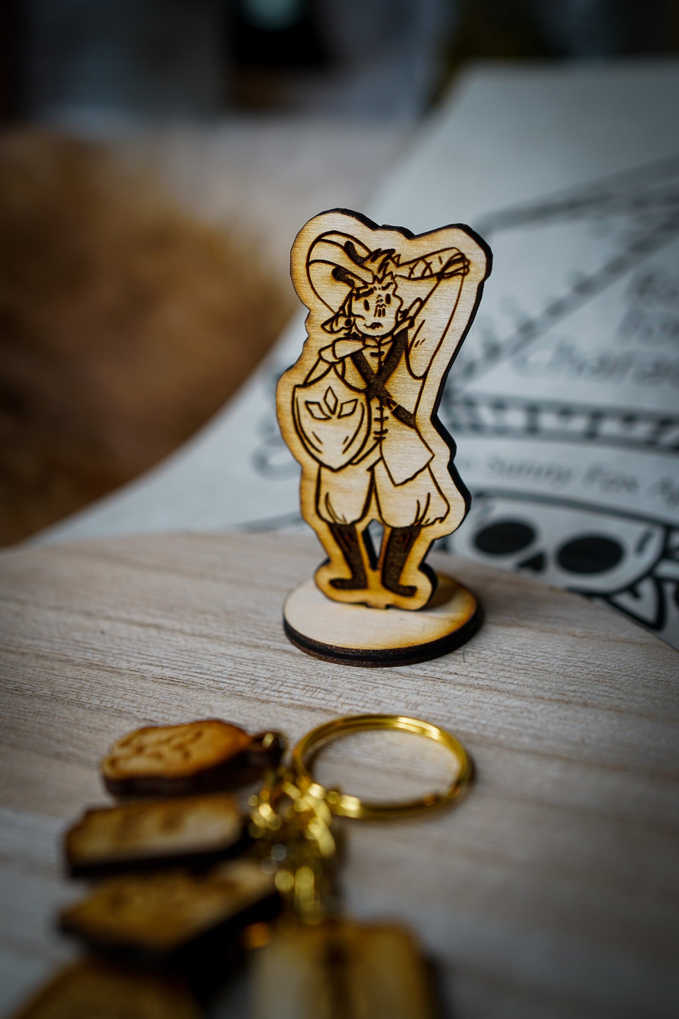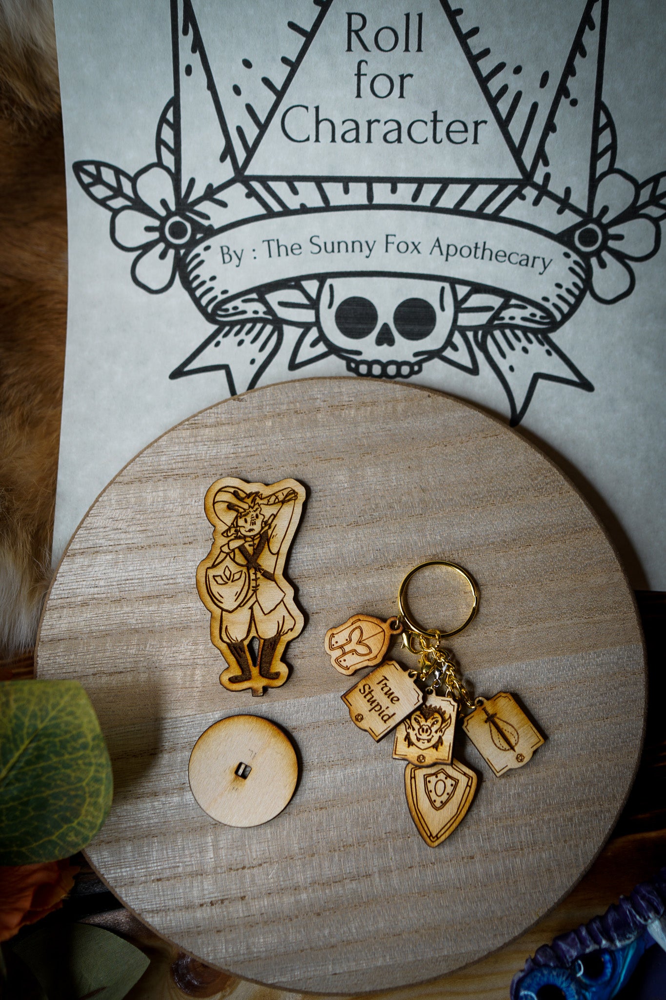 The wooden miniature featured measures 2.5" tall and comes with an assemble-able base. The keychain featured comes with all the charms that represent this character attached with lobster clips.
