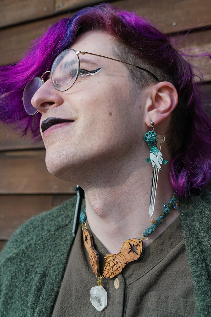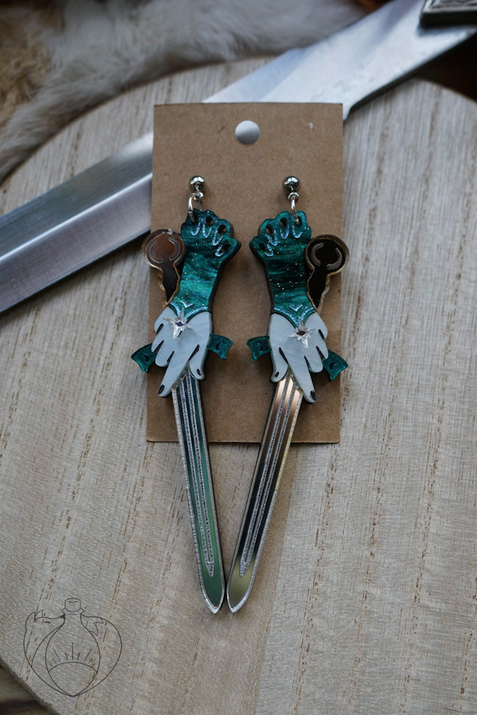 Our Lady of the Lake design is one of our most intricate yet! Made of 7 different kinds of acrylic, these lightweight earrings make a stunning accent piece to any outfit! Each earring measures about 4 inches in length and swings freely from a stud earring. Clip ons available upon request!