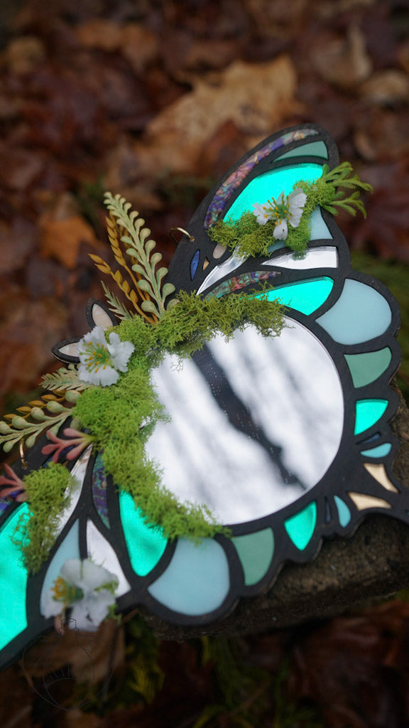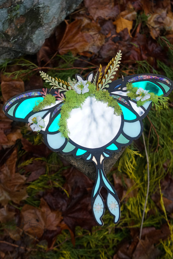 This Luna moth inspired wall mirror is made with wooden frames and inlaid with various kinds of acrylic - mirrored, marbled and glitter. This mirror measures about 10 inches long and 10 inches wide and features a chain at the top to be hung on a wall or in a window.