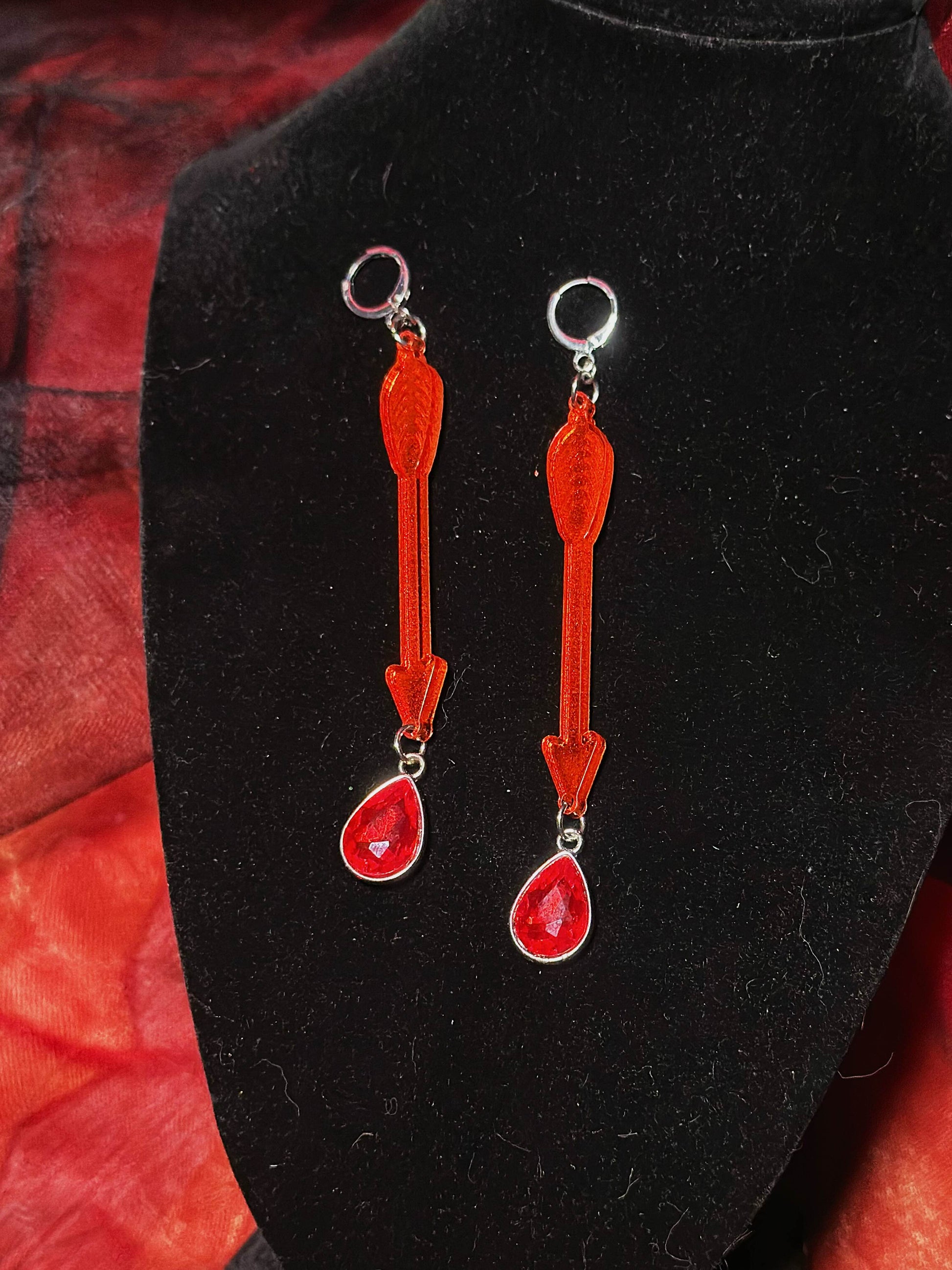 These earrings measure 2" in length and are made with lightweight acrylic and a stunning red glass jewel. They were inspired by Julia's recent promotional films and the arrow that killed her younger self.