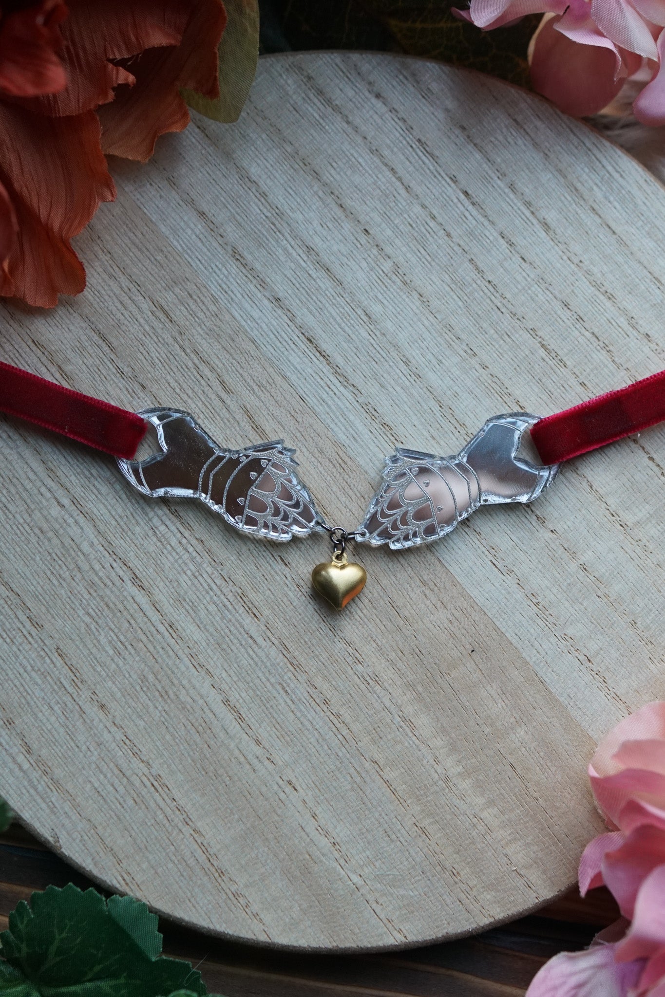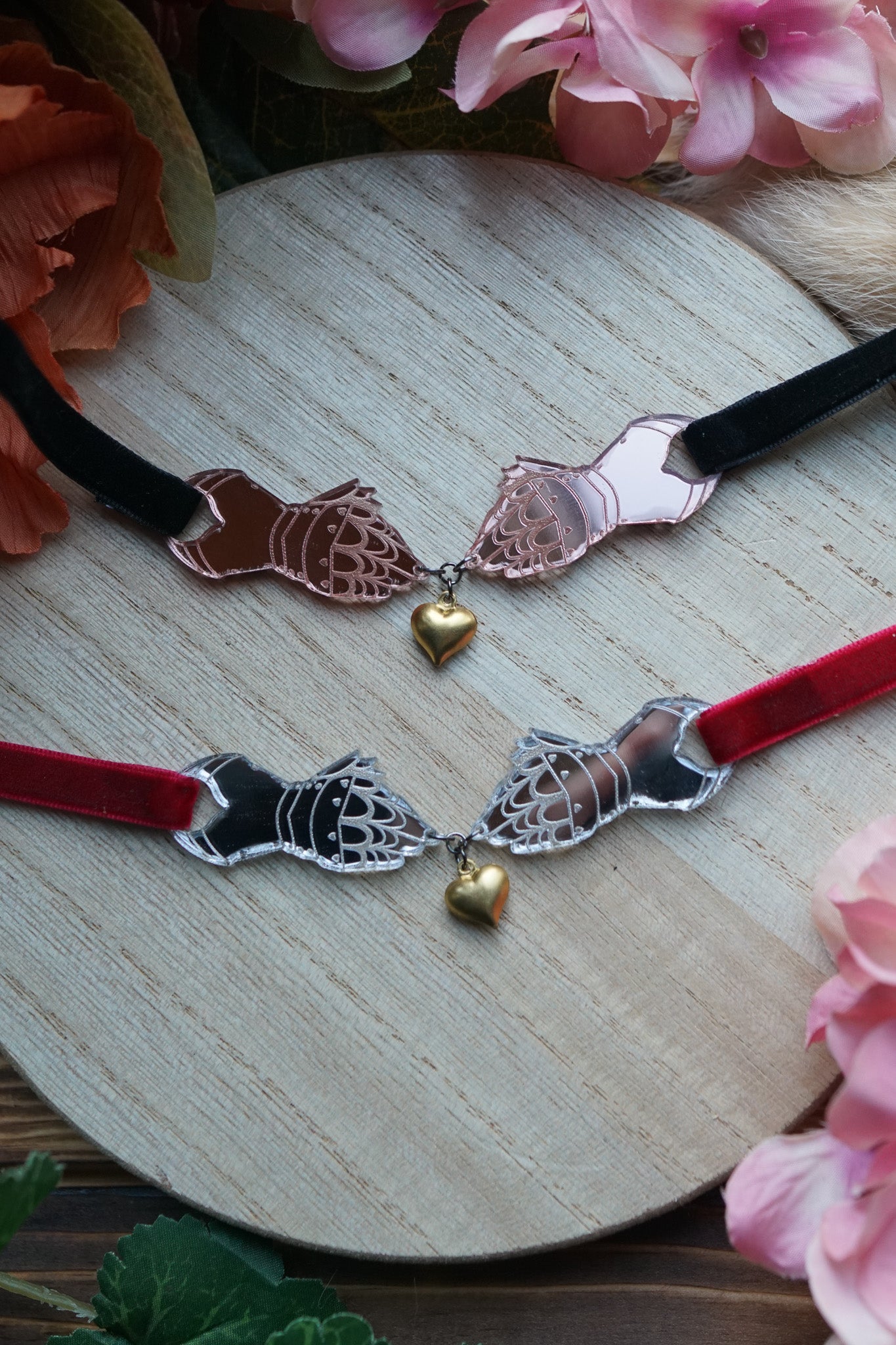The Knight's Love Choker is made with two intricate acrylic gauntlets and red velvet ribbon, measuring about 16" around.
