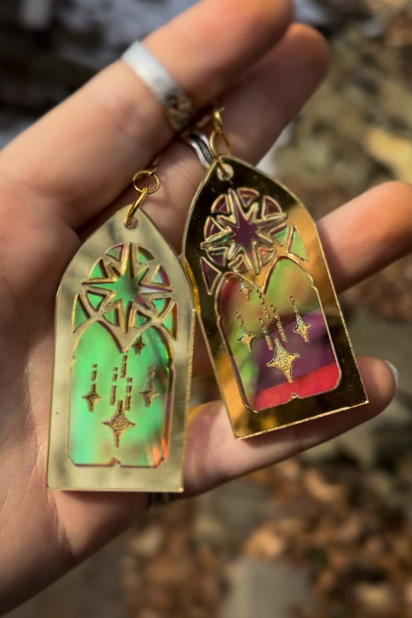These double layer and acrylic earrings hang about 2.5". They are lightweight, made with nickel-free findings. Clip-on bases available upon request.