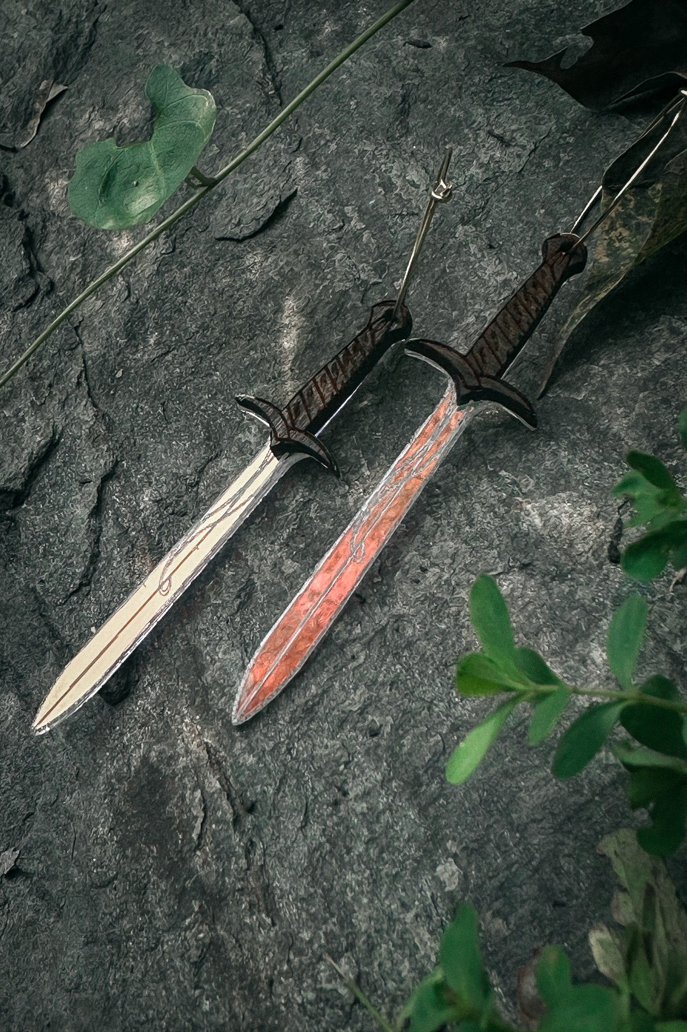 Let our Orc Hunter Earrings empower your next battle! These mighty blades measure 2" long and come on hypoallergenic hoops! Sensitive and gauged ear-friendly! Clipons are available upon request!